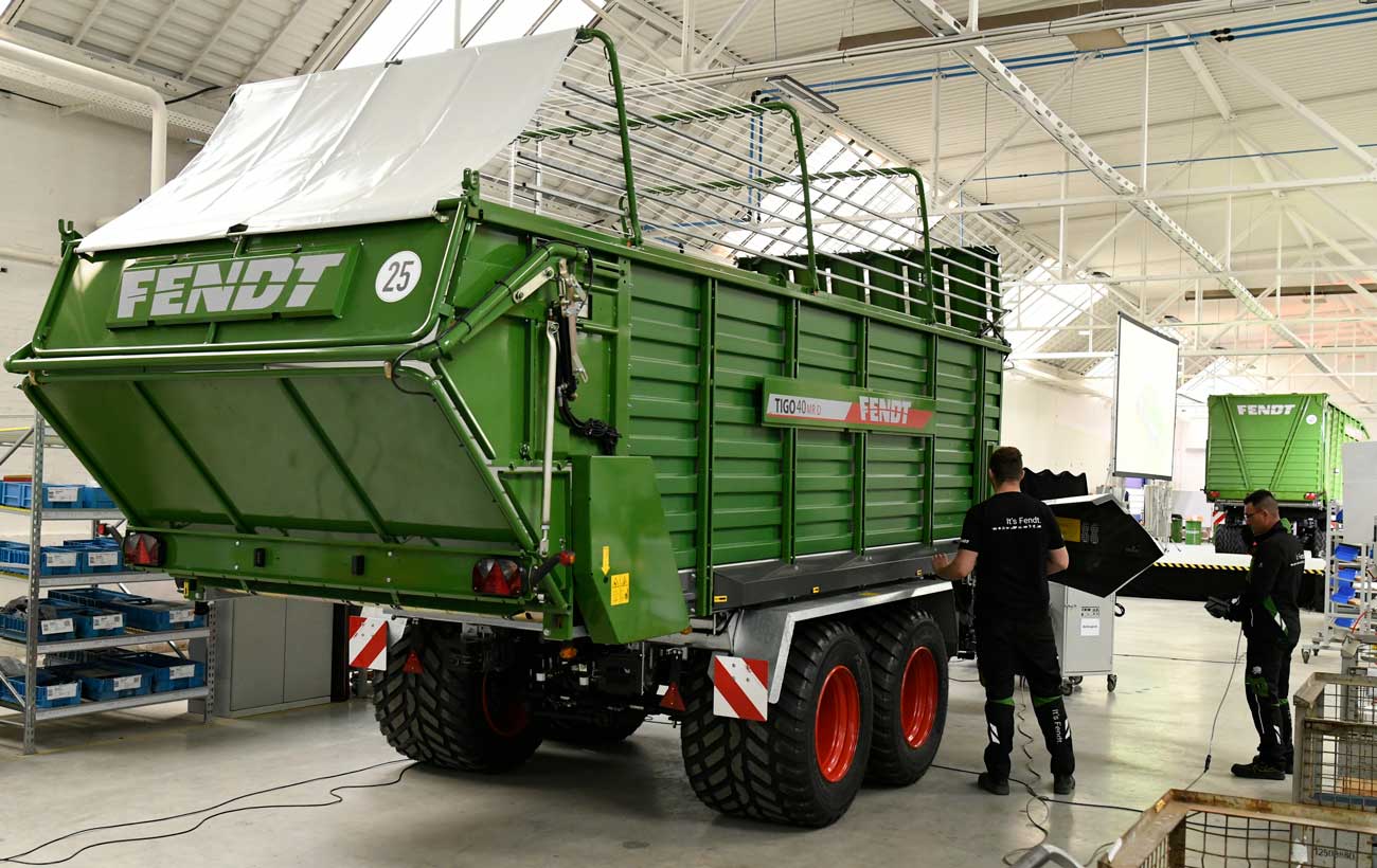 Auf dem Werksgelände im niedersächsischen Wolfenbüttel werden bereits seit 1899 Ballenpressen gefertigt. Im Jahr 2017 hat AGCO/Fendt den traditionsreichen Standort für Ballenpressen in Wolfenbüttel (ehem. Welger Werke) erworben. Seitdem wurden mehr als 20 Mio. Euro investiert, um hier einen modernen und zukunftsfähigen Entwicklungs- und Produktionsstandort aufzubauen. Seit September 2022 werden hier auch alle Modelle der Fendt Ladewagen in einer 4.200 m² großen Produktionshalle montiert. Passend sind weitere 10.000 m² Logistikfläche für die Ladewagenmontage hinzugekommen. Ein neues Montageband ermöglicht die variantenreiche Produktion von acht Baureihen und 25 unterschiedlichen Ladewagen-Modellen auf einer Linie. Mithilfe einer Scherenhebebühne können Arbeitshöhen von bis zu 4,10 m von Mitarbeitenden in der Produktionslinie an den großen Ladewagen durchgeführt werden. Ein neues LED-Lichtkonzept mit Bewegungsmeldern oder die Umstellung auf chromfreie Lacke trägt zu einer nachhaltigeren Produktion bei.