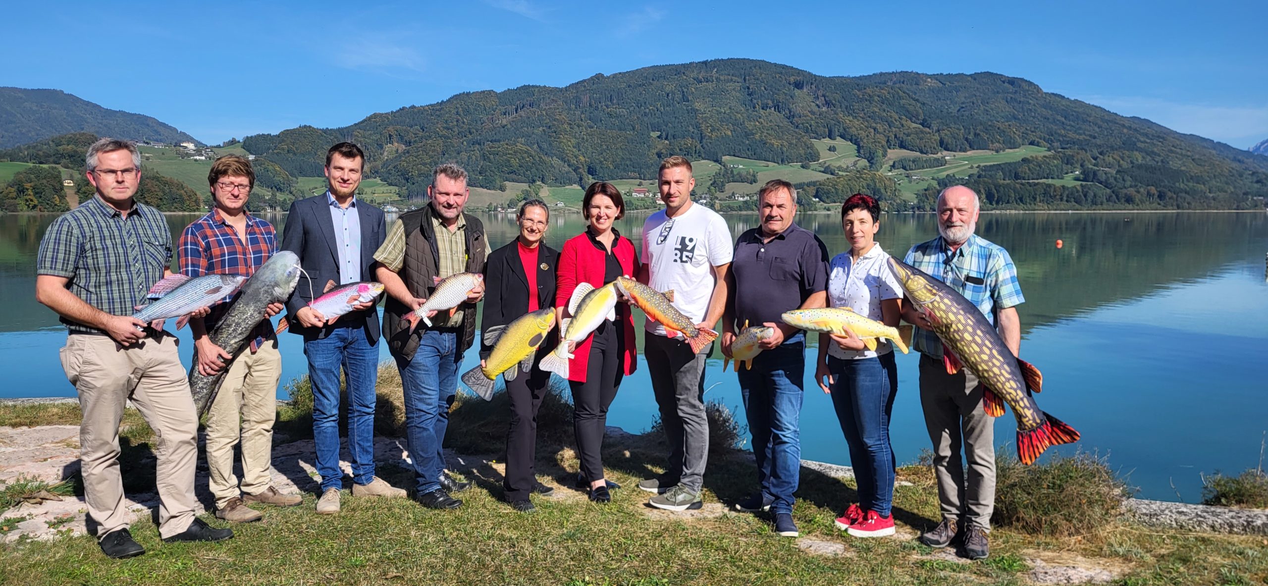 Geballtes Fischereiwissen am Ufer des Mondsees: Klaus Berg (Landesfischereiverband OÖ), Florian Keil (BAW), Leo Kirchmaier (ÖVFA), Martin Mayringer (LK OÖ), Daniela Achleitner (BAW), Agrarlandesrätin Michaela Langer-Weninger, Bernhard Glück, Erich Glück, Gerlinde Schmidsberger (Forellenzuchtverband) und Landes-fischermeister Siegfried Pilgers-torfer (v.l.)