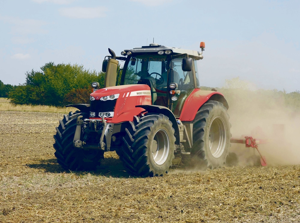 Der getestete MF S 6718 S Dyna-VT ist ausreichend leicht (gut eine halbe Tonne leichter als die Sechszylinder der MF 7700er-Reihe) und absolut nicht untermotorisiert, um 32 Tonnen legale Anhängelast flott zu bewegen. Zudem ist er mit neuneinhalb Tonnen Heckhubkraft imstande, auch alle Geräte zu tragen, die für ihn infrage kommen. Eine schmale (z.B. 420/85R28) Frontbereifung erlaubt bei einer Spurweite von 1,9 Metern laut Herstellerangaben einen Wendekreisradius von 4,75 Metern – das ist sehr gut für diese Leistungsklasse, was der MF 6718 S sowohl der Taillierung von Motorhaube und Chassis als auch dem um 21 Zentimeter kleineren Radstand gegenüber der MF 7700er-Reihe verdankt.